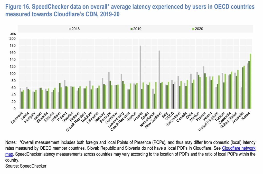 Now, when transit fee rises, peering fees rises also. High transit fees exerted an upward pressure on the paid peering fees that Korean ISPs charge on overseas content providers. As a result, Twitch the game video platform pulled out of Korea citing ‘network fees 10 times more expensive than in most other countries’. On top of that, Cloudflare gave up serving Korea content from Korea but instead serving from Hong Kong or Tokyo, making Korea the market with highest latency among OECD.