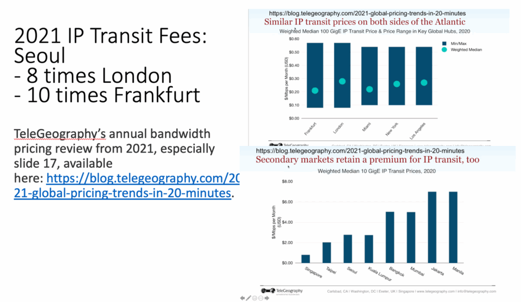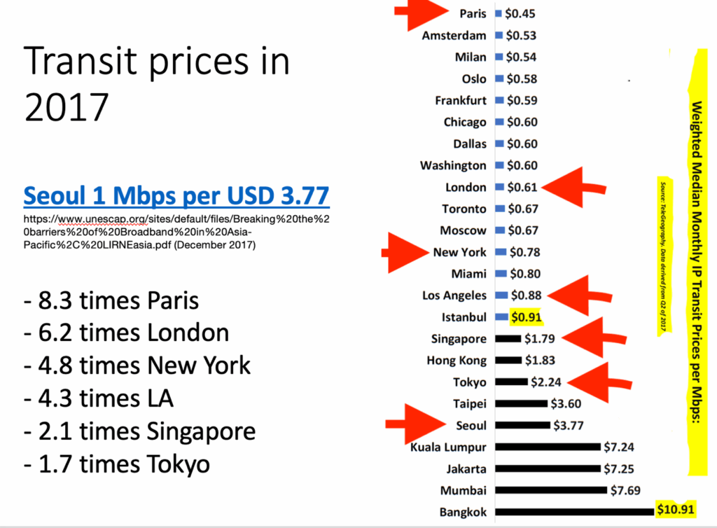 What happened? Telco hosting popular contents like Facebook (ISP1) in the picture above, by definition became the net sender of the traffic because people in ISP2 and ISP3 also pull traffic from ISP1. As a net sender, ISP1 had to pay other telcos under the sender pay rule. Faced with this financial incentive, So competition among ISPs to host popular contents disappeared. Korea became the only country that the transit prices, or the internet access fees for the content providers, did not fall unlike all other countries. As a result, in 2017, the content provider side internet access fee or in short transit became 4-5 times NY/LA or 8-10 times Paris/London.