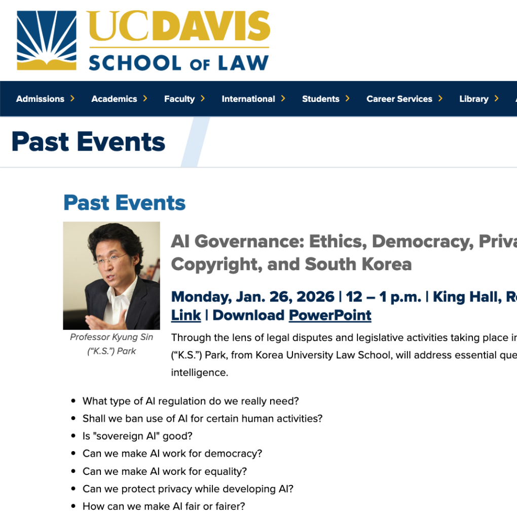 KS Park gave a lecture on artificial intelligence on January 26, 2026 at UC Davis Law School.